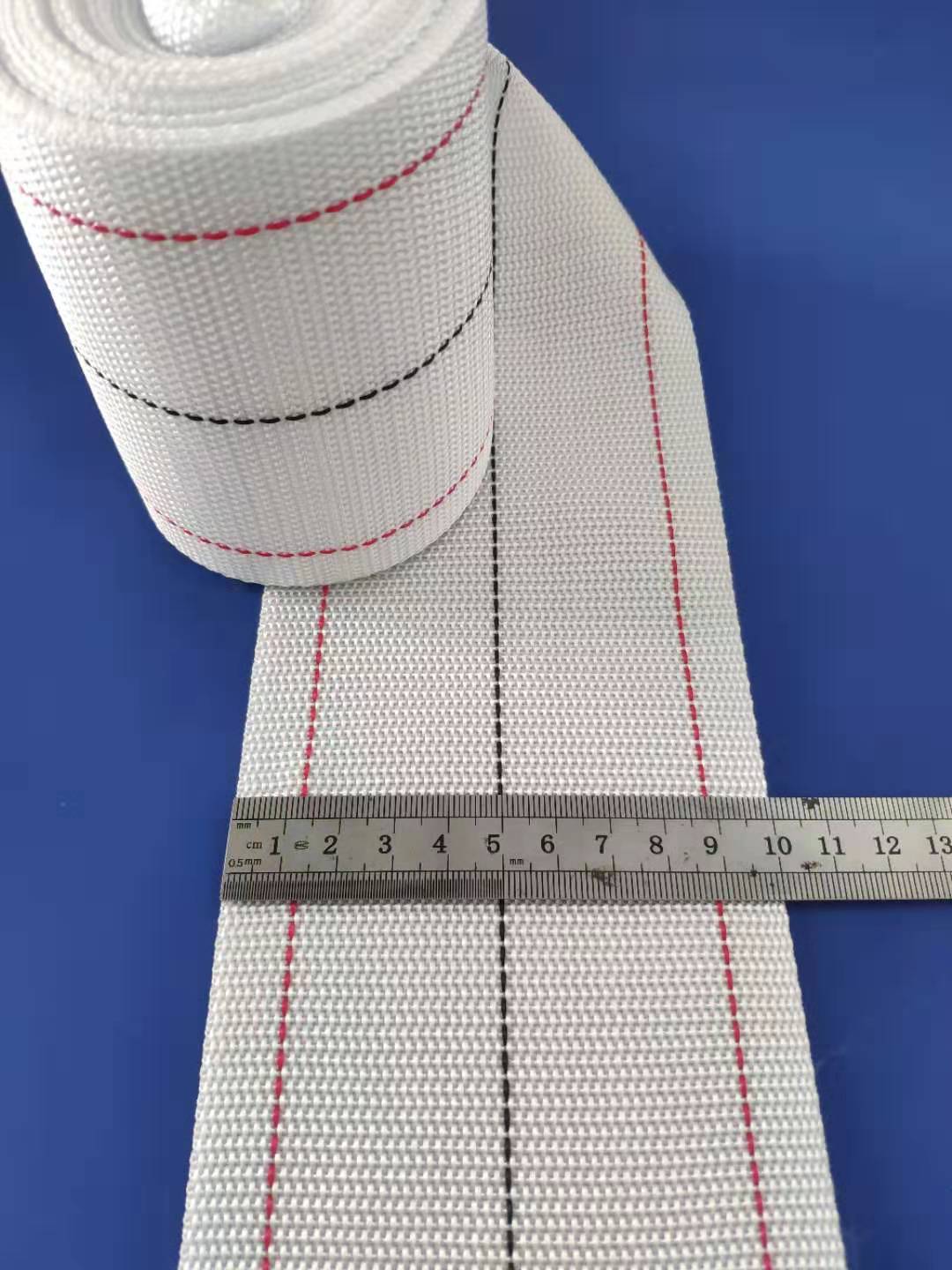 常規規格:寬度:100mm, 長(cháng)度根據要求定制。顏色為白色底色,中間一條藍色線(xiàn),兩邊可加紅色線(xiàn)。